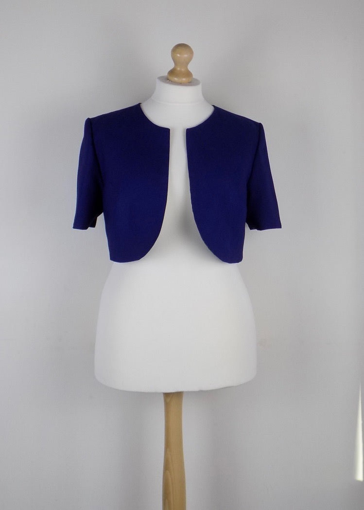 Bolero style jacket in navy wool blend fabric with dark grey lining.