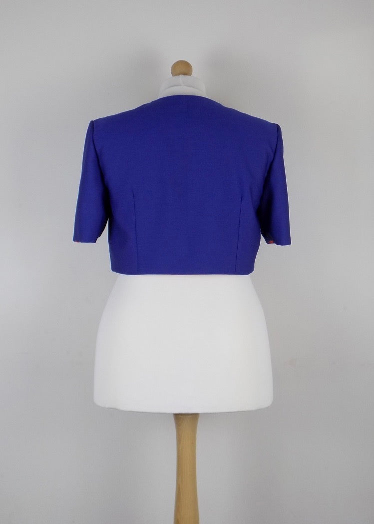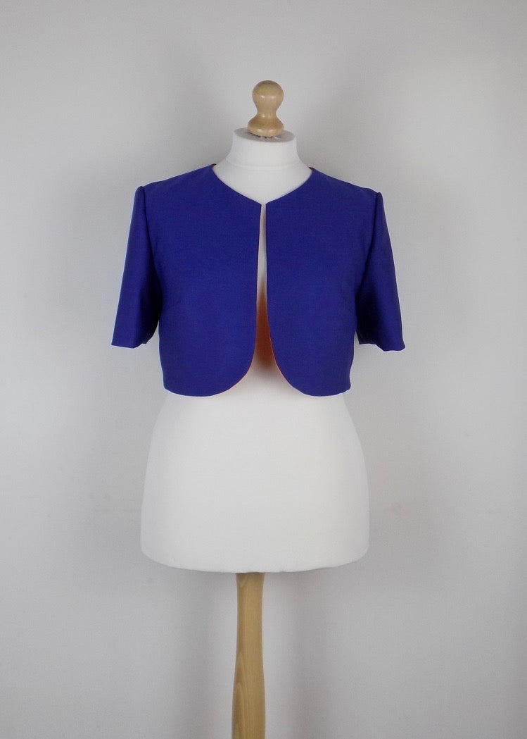 Bolero style jacket in blue wool blend fabric with orange lining.