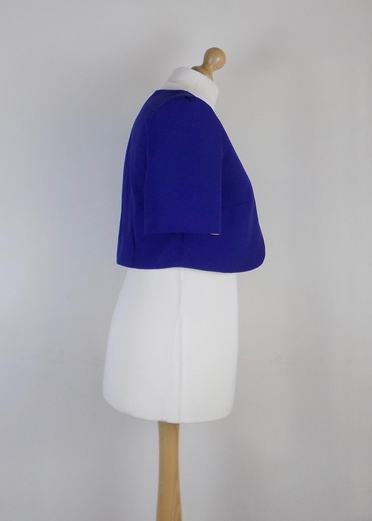 Bolero style jacket in blue wool blend fabric with yellow/white lining.