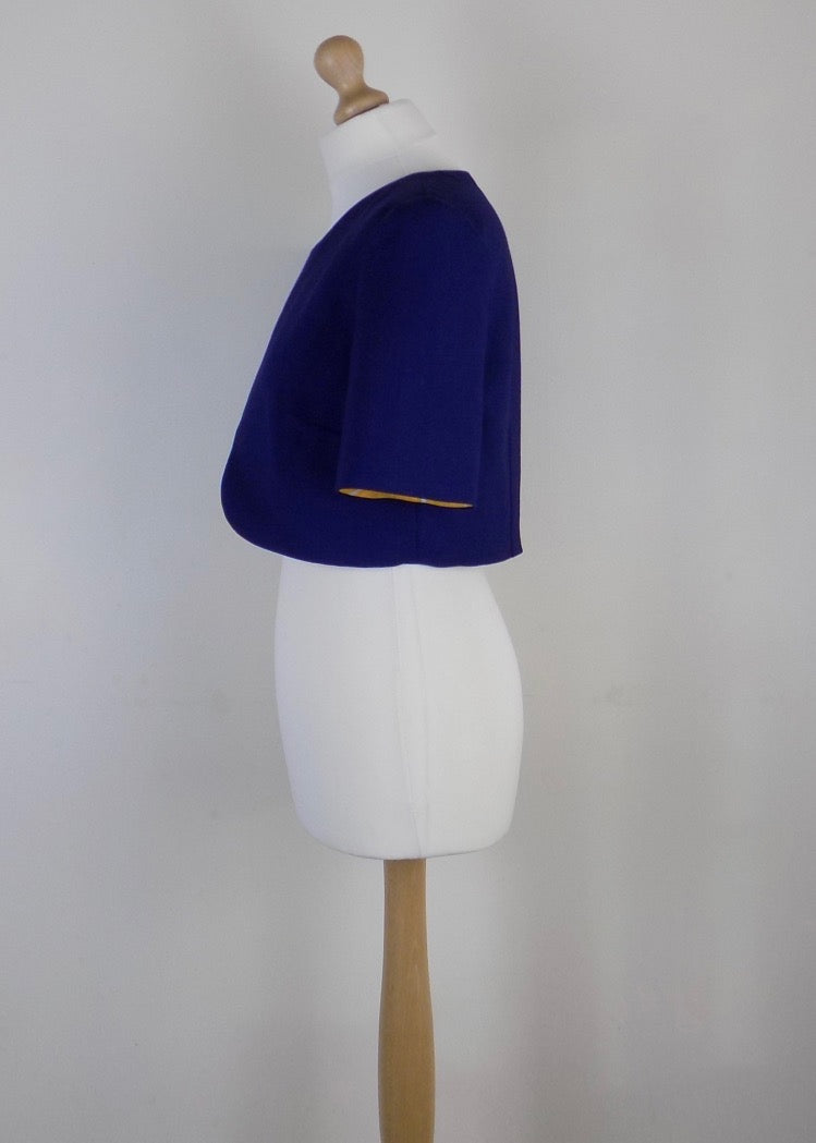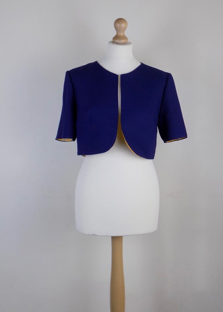 Bolero style jacket in navy wool blend fabric with white/yellow lining.