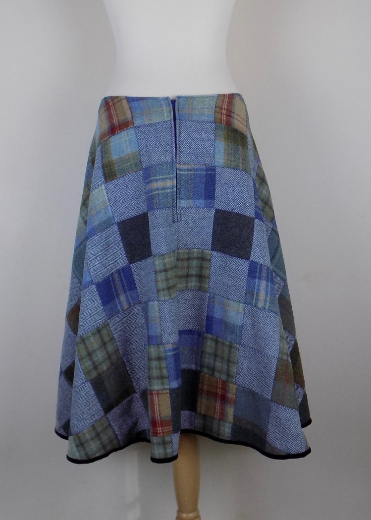 One of a kind skirt, made out of squares of tweed fabrics sewn together in a half-circle pattern.