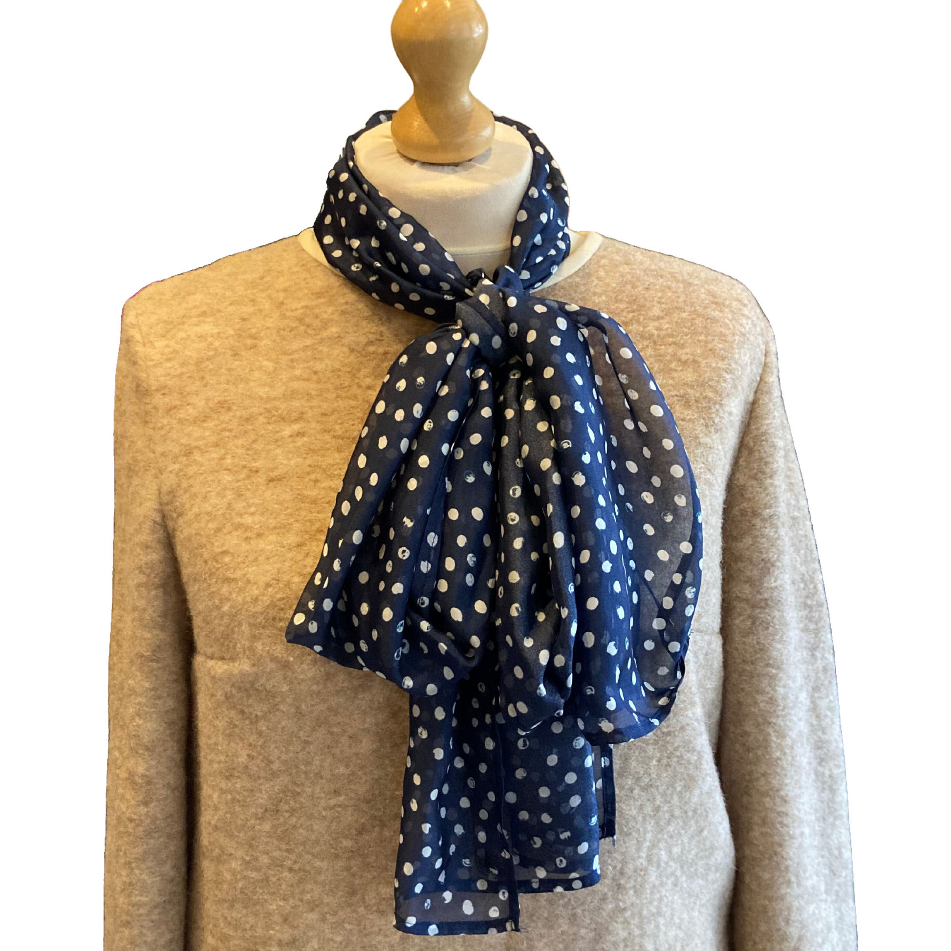 Beautiful, soft to touch white polka dot on navy